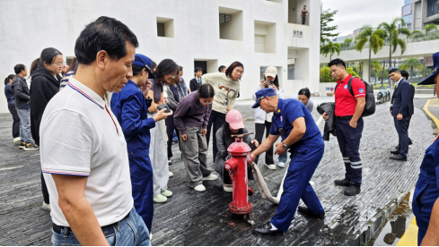 一楼空地的实操环节。在安全保卫部工作人员的指导下,大家依次操作了灭火器、消防水枪及消防栓等设备,通过亲身实践巩固了理论知识,深化了培训效果。